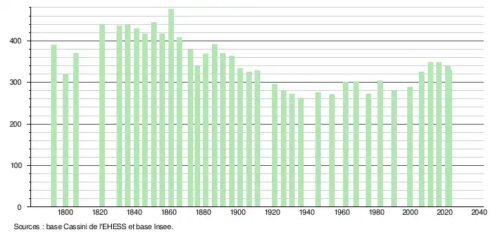 L'évolution du nombre d'habitants est connue à travers les recensements de la population effectués dans la commune depuis 1793. Pour les communes de moins de 10 000 habitants, une enquête de recensement portant sur toute la population est réalisée tous les cinq ans, les populations de référence des années intermédiaires étant quant à elles estimées par interpolation ou extrapolation[26]. Pour la commune, le premier recensement exhaustif entrant dans le cadre du nouveau dispositif a été réalisé en 2006[27].