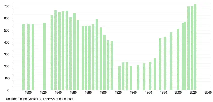 L'évolution du nombre d'habitants est connue à travers les recensements de la population effectués dans la commune depuis 1793. Pour les communes de moins de 10 000 habitants, une enquête de recensement portant sur toute la population est réalisée tous les cinq ans, les populations de référence des années intermédiaires étant quant à elles estimées par interpolation ou extrapolation[31]. Pour la commune, le premier recensement exhaustif entrant dans le cadre du nouveau dispositif a été réalisé en 2008[32].