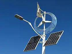 Un lampadaire hybride est un lampadaire autonome alimenté à la fois par l'énergie solaire et l'énergie éolienne, c'est-à-dire qu'il est équipé de panneaux solaires photovoltaïques et d'une petite éolienne. Ce type de lampadaire fournit un éclairage public totalement gratuit et entièrement écologique.