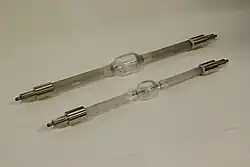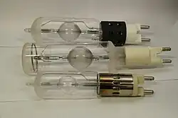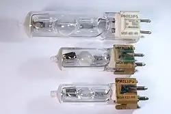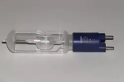 Les lampes aux halogénures métalliques sont des lampes à arc de taille moyenne avec cycle halogène. Elles sont relativement similaires aux lampes à vapeur de mercure mais les éléments constitutifs sont différents. L'ampoule est composée d'une sphère (le bulbe) en quartz[13] résistant à la pression (35 bars)[13] et à la température (950 °C)[13] et de forte épaisseur (jusqu'à 5 mm)[13] associée à deux longues électrodes[13].