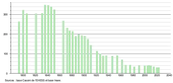 L'évolution du nombre d'habitants est connue à travers les recensements de la population effectués dans la commune depuis 1793. Pour les communes de moins de 10 000 habitants, une enquête de recensement portant sur toute la population est réalisée tous les cinq ans, les populations de référence des années intermédiaires étant quant à elles estimées par interpolation ou extrapolation[19]. Pour la commune, le premier recensement exhaustif entrant dans le cadre du nouveau dispositif a été réalisé en 2004[20].