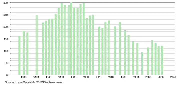 L'évolution du nombre d'habitants est connue à travers les recensements de la population effectués dans la commune depuis 1793. Pour les communes de moins de 10 000 habitants, une enquête de recensement portant sur toute la population est réalisée tous les cinq ans, les populations de référence des années intermédiaires étant quant à elles estimées par interpolation ou extrapolation[21]. Pour la commune, le premier recensement exhaustif entrant dans le cadre du nouveau dispositif a été réalisé en 2006[22].