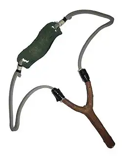 - lance-pierre rustique, de fabrication artisanale. Un morceau de bois en Y, un élastique en caoutchouc (élastique à garrot, chambre à air de vélo…).