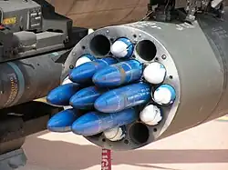 On trouve des paniers de roquettes d'hélicoptère d'attaque et d'avion d'attaque au sol, placés sous les ailettes ou les ailes.