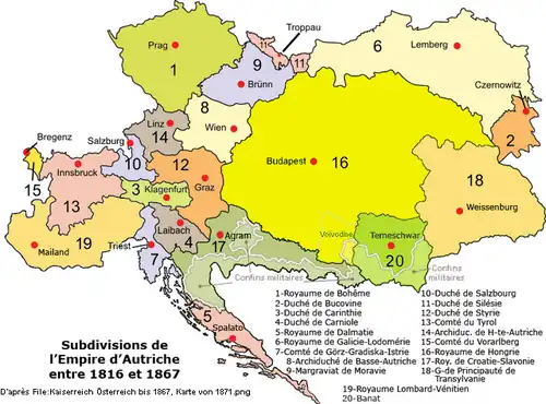 - ↑ Jean Bérenger, L'Autriche-Hongrie : 1815-1918, Armand Colin 1998, (ISBN 978-2200217433 et 2200217439).