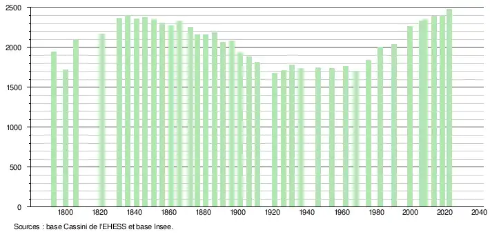 L'évolution du nombre d'habitants est connue à travers les recensements de la population effectués dans la commune depuis 1793. Pour les communes de moins de 10 000 habitants, une enquête de recensement portant sur toute la population est réalisée tous les cinq ans, les populations de référence des années intermédiaires étant quant à elles estimées par interpolation ou extrapolation[35]. Pour la commune, le premier recensement exhaustif entrant dans le cadre du nouveau dispositif a été réalisé en 2008[36].