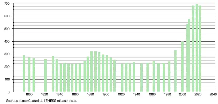 L'évolution du nombre d'habitants est connue à travers les recensements de la population effectués dans la commune depuis 1793. Pour les communes de moins de 10 000 habitants, une enquête de recensement portant sur toute la population est réalisée tous les cinq ans, les populations de référence des années intermédiaires étant quant à elles estimées par interpolation ou extrapolation[39]. Pour la commune, le premier recensement exhaustif entrant dans le cadre du nouveau dispositif a été réalisé en 2008[40].