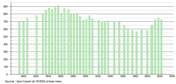 L'évolution du nombre d'habitants est connue à travers les recensements de la population effectués dans la commune depuis 1793. Pour les communes de moins de 10 000 habitants, une enquête de recensement portant sur toute la population est réalisée tous les cinq ans, les populations de référence des années intermédiaires étant quant à elles estimées par interpolation ou extrapolation[49]. Pour la commune, le premier recensement exhaustif entrant dans le cadre du nouveau dispositif a été réalisé en 2007[50].