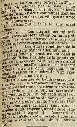 Landrévarzec est détaché de Briec par la loi du [47] ; le projet de loi tendant à distraire la section de Landrévarzec de la commune de Briec a été discuté à l'Assemblée nationale le [48].