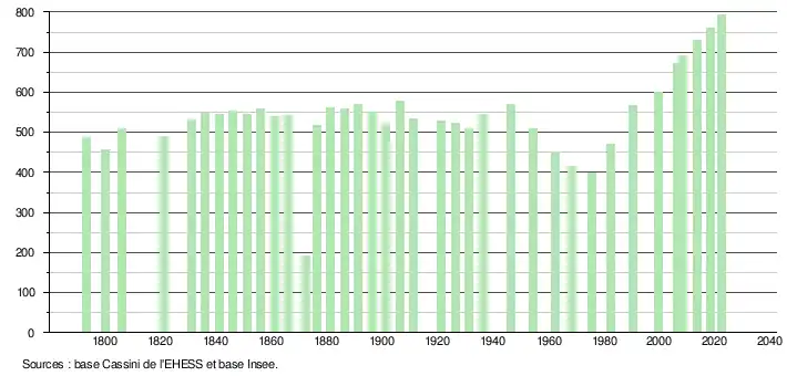 L'évolution du nombre d'habitants est connue à travers les recensements de la population effectués dans la commune depuis 1793. Pour les communes de moins de 10 000 habitants, une enquête de recensement portant sur toute la population est réalisée tous les cinq ans, les populations de référence des années intermédiaires étant quant à elles estimées par interpolation ou extrapolation[39]. Pour la commune, le premier recensement exhaustif entrant dans le cadre du nouveau dispositif a été réalisé en 2008[40].