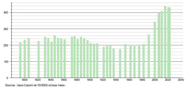L'évolution du nombre d'habitants est connue à travers les recensements de la population effectués dans la commune depuis 1793. Pour les communes de moins de 10 000 habitants, une enquête de recensement portant sur toute la population est réalisée tous les cinq ans, les populations de référence des années intermédiaires étant quant à elles estimées par interpolation ou extrapolation[24]. Pour la commune, le premier recensement exhaustif entrant dans le cadre du nouveau dispositif a été réalisé en 2005[25].