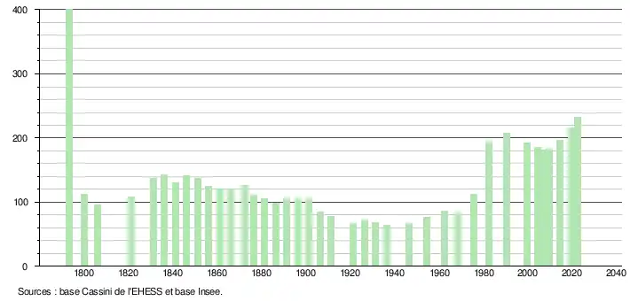 L'évolution du nombre d'habitants est connue à travers les recensements de la population effectués dans la commune depuis 1793. Pour les communes de moins de 10 000 habitants, une enquête de recensement portant sur toute la population est réalisée tous les cinq ans, les populations de référence des années intermédiaires étant quant à elles estimées par interpolation ou extrapolation[15]. Pour la commune, le premier recensement exhaustif entrant dans le cadre du nouveau dispositif a été réalisé en 2004[16].