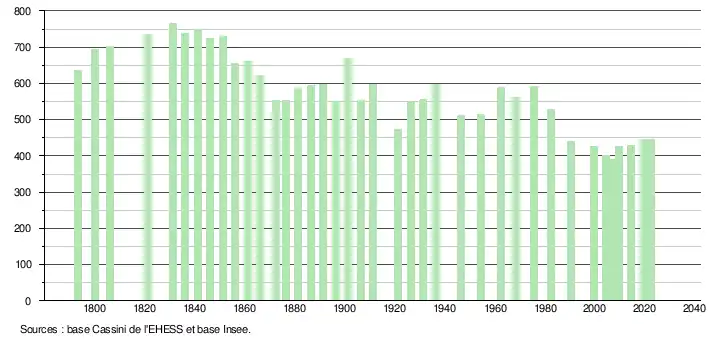 L'évolution du nombre d'habitants est connue à travers les recensements de la population effectués dans la commune depuis 1793. Pour les communes de moins de 10 000 habitants, une enquête de recensement portant sur toute la population est réalisée tous les cinq ans, les populations de référence des années intermédiaires étant quant à elles estimées par interpolation ou extrapolation[17]. Pour la commune, le premier recensement exhaustif entrant dans le cadre du nouveau dispositif a été réalisé en 2004[18].