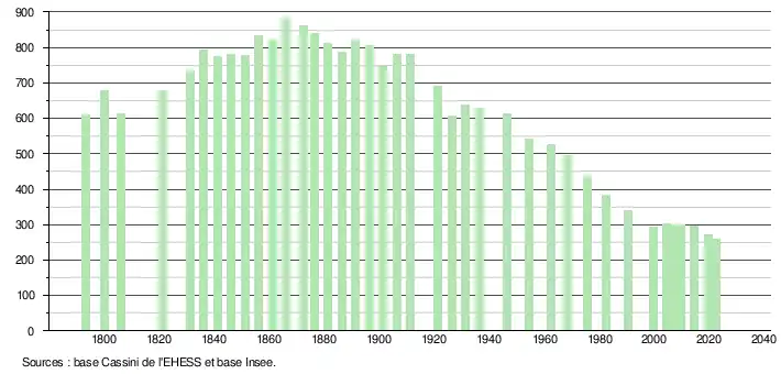 L'évolution du nombre d'habitants est connue à travers les recensements de la population effectués dans la commune depuis 1793. Pour les communes de moins de 10 000 habitants, une enquête de recensement portant sur toute la population est réalisée tous les cinq ans, les populations de référence des années intermédiaires étant quant à elles estimées par interpolation ou extrapolation[27]. Pour la commune, le premier recensement exhaustif entrant dans le cadre du nouveau dispositif a été réalisé en 2004[28].