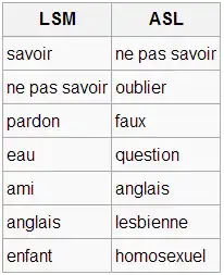 La LSM est liée à la vieille langue des signes française, langue qui a aussi été à l'origine de la langue des signes américaine (ASL), ce qui explique les similitudes de l'ASL et de la LSM[9]. Les études de Smith-Stark (1986) et de Bickford (1991) montrent une similarité linguistique de 23 % entre ces deux langues, mais il existe aussi 17 % des signes qui sont des faux-amis, certains pouvant poser des problèmes car ils sont similaires d'un point de vue sémantique, d'un sens réellement différent ou même potentiellement offensant, comme le montre le tableau de droite[8].