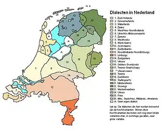 - Bildts, Midslands, Stadsfries et Amelands (dialectes influencés par l'hollandais minoritaires en province de Frise)