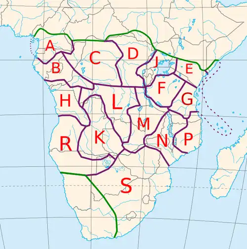 Carte des zones géographiques de langues bantoues selon Guthrie (avec la zone J de Tervuren).