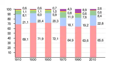 | 1950 | 72,1 | 20,3 | 5,9 | 1,0 | 0,7 |
