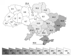 Le russe domine à l’Est et au Sud du pays. Le fait que la plupart des Ukrainiens comprennent le russe couramment est dû à la proximité des deux langues et à l’intégration jusqu’en 1991 de l’Ukraine dans l’Union soviétique, mais aussi à un passé plus ancien, les deux tiers Est et Sud du pays, avec la capitale Kiev, ayant fait partie pendant plus de trois siècles de l’Empire russe, d’où la présence de 17 % de russophones usuels[2] et, en 2001, de 29,6 % de russophones natifs[3].