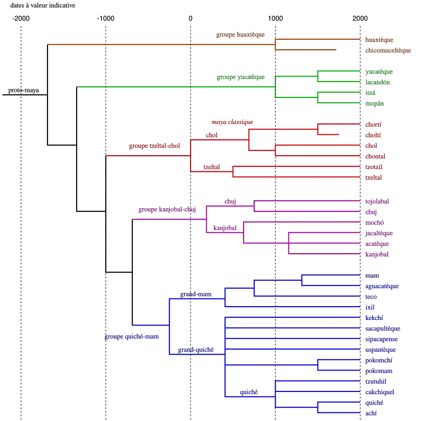 Le proto-maya s'est scindé en cinq groupes linguistiques entre 1600 et 700 av. J.-C. Les premières branches à se séparer sont la huaxtèques et la yucatèque dans le nord. Ensuite, suivent les groupes tzeltal-chol, kanjobal-chuj, groupe quiché-mam.