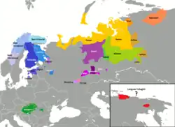 Répartition approximative des branches des langues ouraliennes : finno-permiennes (en bleu), ougriennes (en vert), samoyèdes (en jaune). Le youkaguir, peut-être rattaché à l'ouralien, est en magenta. | |