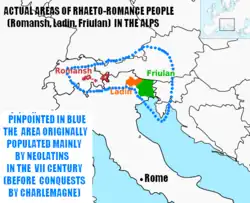 L'aire linguistique des idiomes rhéto-romans a varié dans le temps, ils formaient un ensemble continu avant leur morcellement et leur réduction au nord de leur espace actuel (dans le canton de Saint-Gall, dans le nord du canton des Grisons, au Liechtenstein, et en Autriche au Vorarlberg et au Tyrol) sous la pression germanique. La tradition romane et la langue romanche s'y maintinrent jusqu'à la fin du Moyen Âge comme l'attestent les plus anciennes chansons populaires[3].