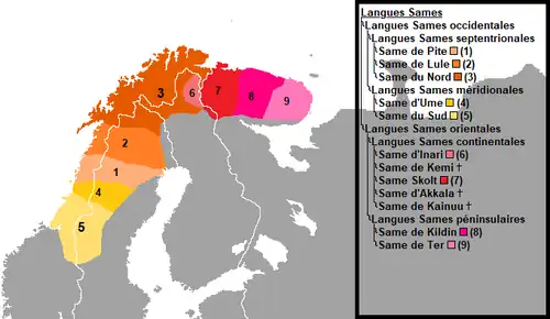 Le same (prononcé : /sam/[1]) se subdivise en neuf aires linguistiques (plus deux langues éteintes), parfois considérées comme des variantes dialectales d'une même langue. Certains spécialistes[2], hors du conseil same et des institutions linguistiques norvégiennes et suédoises, les considèrent toutefois aujourd’hui comme des langues à part entière. Les langues sames sont classées de la manière suivante[3] :