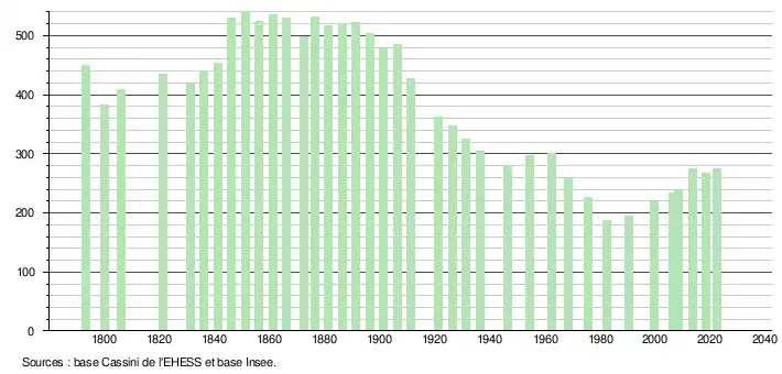 L'évolution du nombre d'habitants est connue à travers les recensements de la population effectués dans la commune depuis 1793. Pour les communes de moins de 10 000 habitants, une enquête de recensement portant sur toute la population est réalisée tous les cinq ans, les populations de référence des années intermédiaires étant quant à elles estimées par interpolation ou extrapolation[17]. Pour la commune, le premier recensement exhaustif entrant dans le cadre du nouveau dispositif a été réalisé en 2008[18].