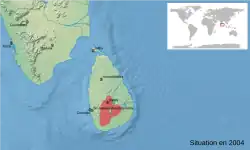 Cette espèce est endémique du centre-Sud-Ouest du Sri Lanka. Elle se rencontre entre 60 et 1 525 m d'altitude[1],[2].