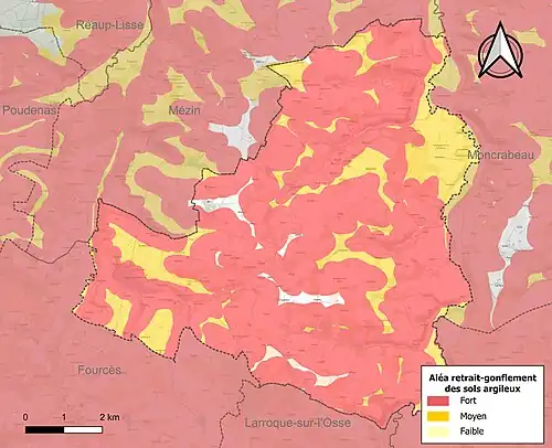 Le retrait-gonflement des sols argileux est susceptible d'engendrer des dommages importants aux bâtiments en cas d’alternance de périodes de sécheresse et de pluie[19]. 97,8 % de la superficie communale est en aléa moyen ou fort (91,8 % au niveau départemental et 48,5 % au niveau national)[Carte 2]. Depuis le , en application de la loi ELAN, différentes contraintes s'imposent aux vendeurs, maîtres d'ouvrages ou constructeurs de biens situés dans une zone classée en aléa moyen ou fort[Note 3],[20].