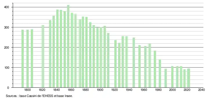L'évolution du nombre d'habitants est connue à travers les recensements de la population effectués dans la commune depuis 1793. Pour les communes de moins de 10 000 habitants, une enquête de recensement portant sur toute la population est réalisée tous les cinq ans, les populations de référence des années intermédiaires étant quant à elles estimées par interpolation ou extrapolation[19]. Pour la commune, le premier recensement exhaustif entrant dans le cadre du nouveau dispositif a été réalisé en 2006[20].