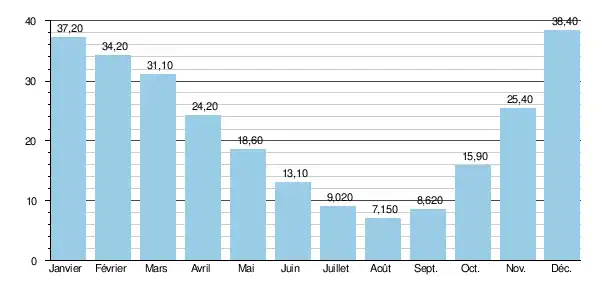 Le débit instantané maximal enregistré a été de 286 m3/s le , tandis que la valeur journalière maximale était de 240 m3/s le . En comparant ces valeurs avec l'échelle des QIX de la rivière, il ressort que les crues de étaient d'ordre cinquantennal, et donc assez exceptionnelles.