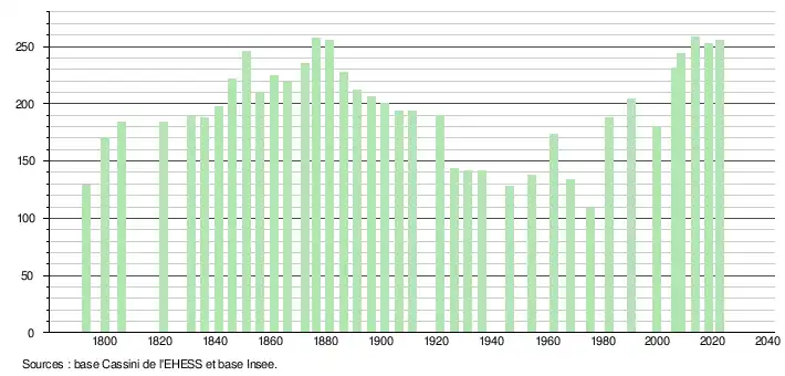 L'évolution du nombre d'habitants est connue à travers les recensements de la population effectués dans la commune depuis 1793. Pour les communes de moins de 10 000 habitants, une enquête de recensement portant sur toute la population est réalisée tous les cinq ans, les populations de référence des années intermédiaires étant quant à elles estimées par interpolation ou extrapolation[12]. Pour la commune, le premier recensement exhaustif entrant dans le cadre du nouveau dispositif a été réalisé en 2008[13].