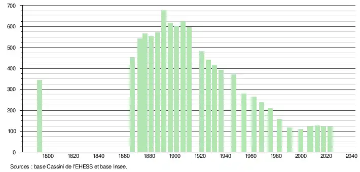 L'évolution du nombre d'habitants est connue à travers les recensements de la population effectués dans la commune depuis 1793. Pour les communes de moins de 10 000 habitants, une enquête de recensement portant sur toute la population est réalisée tous les cinq ans, les populations de référence des années intermédiaires étant quant à elles estimées par interpolation ou extrapolation[13]. Pour la commune, le premier recensement exhaustif entrant dans le cadre du nouveau dispositif a été réalisé en 2007[14].