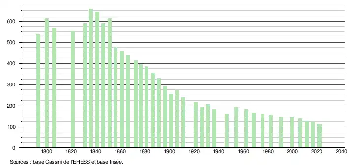 L'évolution du nombre d'habitants est connue à travers les recensements de la population effectués dans la commune depuis 1793. Pour les communes de moins de 10 000 habitants, une enquête de recensement portant sur toute la population est réalisée tous les cinq ans, les populations de référence des années intermédiaires étant quant à elles estimées par interpolation ou extrapolation[16]. Pour la commune, le premier recensement exhaustif entrant dans le cadre du nouveau dispositif a été réalisé en 2006[17].