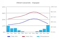 Les températures maximales oscillent à Lanzarote entre 22 et 25 °C tandis que les minimales ne descendent pas en dessous des 12 °C en hiver. La moyenne annuelle des précipitations est de 200 millimètres avec des variations entre 250 millimètres à Famara et seulement 50 millimètres dans la zone de la côte du Rubicon. Le climat est beaucoup plus tempéré que sa latitude ne le laisse supposer. Deux éléments climatiques participent à cette douceur atmosphérique : les alizés et le courant froid des Canaries. Le vent est présent pratiquement en permanence sur l'île. Les mois d'été, le sirocco (aussi appelé calima aux îles Canaries) souffle parfois violemment, provoquant des tempêtes chargées de sable du désert qui réduisent fortement la visibilité et faisant monter les températures jusqu'à plus de quarante degrés Celsius (46 °C en 2004).