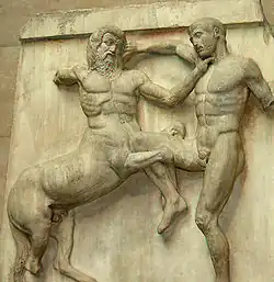 L'un de leurs rois fut Pirithoos, fils et successeur du roi Ixion, demi-frère des centaures, qui refusa de donner leur part d'héritage aux centaures : une guerre s'ensuivit. Lors des noces entre Pirithoos et Hippodamie (nom qui rappelle d'ailleurs l'aspect chevalin des Centaures), le roi Pirithoos invita son parent le centaure Eurytion. Ce dernier devint rapidement soûl durant les festivités, et tenta d'abuser de la femme du roi des Lapithes. Les Lapithes le chassèrent du palais après lui avoir coupé les oreilles et le nez. Voulant se venger, les Centaures s'arment de pierres énormes et de pins gigantesques et attaquent le banquet. Pirithoos, aidé du héros Thésée, rassemble ses hommes, reprend l'avantage et massacre les Centaures[4].