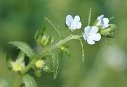 - Fleurs très petites (2 à 4 millimètres de large), bleues (et rarement blanches), positionnées près des rameaux avec racème de cymes unipares scorpioïdes, unilatéral, qui s'allonge en devenant lâche ;