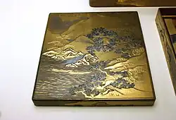 - Décor hiramaki-e : les différents décors sont en faible relief sur le fond (pas plus que l'épaisseur d'une couche de laque).