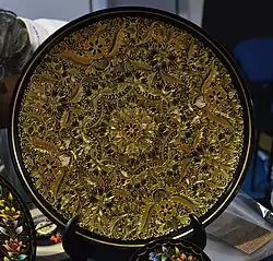 L'aplicado est quand les dessins sont peints sur une couche de base, une technique également utilisée dans d'autres régions du Mexique[2],[4]. Cette technique remonte au moins au XVIIIe siècle et, bien qu’elle puisse comporter des motifs tels que des symboles patriotiques, la plupart ne sont pas mexicaines, mais présentent des fleurs stylisées, des paysages européens et des images asiatiques[2],[4]. Il est possible de combiner les deux techniques, appelées punteado (pointillés), dans lesquelles les petits points sont peints dans des zones non gravées. Cela est devenu populaire à partir de la fin des années 1970[2]. Comme les pièces de rayado, les animaux, les fleurs et les dessins géométriques sont prédominants et tout l’espace disponible est rempli[2],[4].