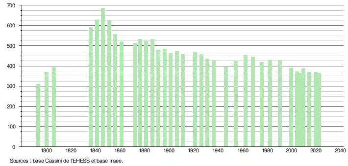L'évolution du nombre d'habitants est connue à travers les recensements de la population effectués dans la commune depuis 1793. Pour les communes de moins de 10 000 habitants, une enquête de recensement portant sur toute la population est réalisée tous les cinq ans, les populations de référence des années intermédiaires étant quant à elles estimées par interpolation ou extrapolation[18]. Pour la commune, le premier recensement exhaustif entrant dans le cadre du nouveau dispositif a été réalisé en 2004[19].