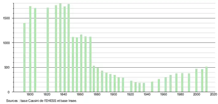 L'évolution du nombre d'habitants est connue à travers les recensements de la population effectués dans la commune depuis 1793. À partir du , les populations légales des communes sont publiées annuellement dans le cadre d'un recensement qui repose désormais sur une collecte d'information annuelle, concernant successivement tous les territoires communaux au cours d'une période de cinq ans. Pour les communes de moins de 10 000 habitants, une enquête de recensement portant sur toute la population est réalisée tous les cinq ans, les populations légales des années intermédiaires étant quant à elles estimées par interpolation ou extrapolation[4]. Pour la commune, le premier recensement exhaustif entrant dans le cadre du nouveau dispositif a été réalisé en 2006[5],[Note 1].