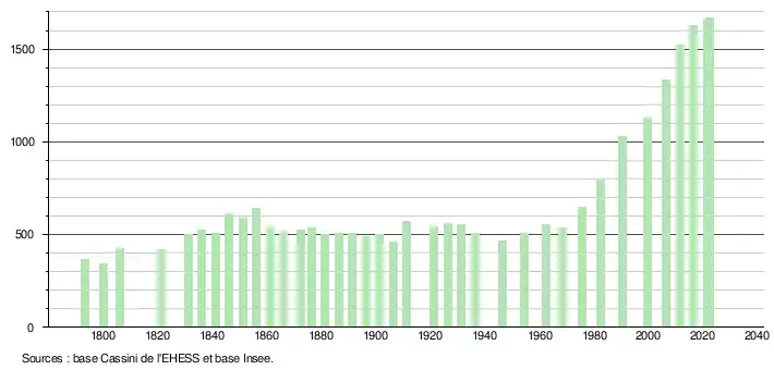 L'évolution du nombre d'habitants est connue à travers les recensements de la population effectués dans la commune depuis 1793. Pour les communes de moins de 10 000 habitants, une enquête de recensement portant sur toute la population est réalisée tous les cinq ans, les populations de référence des années intermédiaires étant quant à elles estimées par interpolation ou extrapolation[28]. Pour la commune, le premier recensement exhaustif entrant dans le cadre du nouveau dispositif a été réalisé en 2006[29].