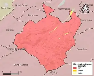 Le retrait-gonflement des sols argileux est susceptible d'engendrer des dommages importants aux bâtiments en cas d’alternance de périodes de sécheresse et de pluie. La totalité de la commune est en aléa moyen ou fort (88,8 % au niveau départemental et 48,5 % au niveau national). Sur les 171 bâtiments dénombrés sur la commune en 2019, 171 sont en aléa moyen ou fort, soit 100 %, à comparer aux 98 % au niveau départemental et 54 % au niveau national. Une cartographie de l'exposition du territoire national au retrait gonflement des sols argileux est disponible sur le site du BRGM[26],[Carte 3].