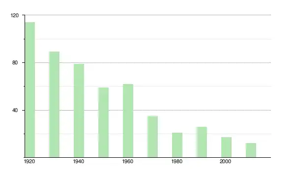 | 1930 | 89 | ▼ −21,93 % | |