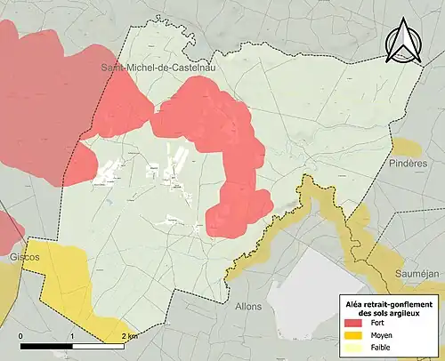 Le retrait-gonflement des sols argileux est susceptible d'engendrer des dommages importants aux bâtiments en cas d’alternance de périodes de sécheresse et de pluie. 26,2 % de la superficie communale est en aléa moyen ou fort (67,4 % au niveau départemental et 48,5 % au niveau national). Sur les 43 bâtiments dénombrés sur la commune en 2019, 19 sont en aléa moyen ou fort, soit 44 %, à comparer aux 84 % au niveau départemental et 54 % au niveau national. Une cartographie de l'exposition du territoire national au retrait gonflement des sols argileux est disponible sur le site du BRGM[21],[Carte 2].