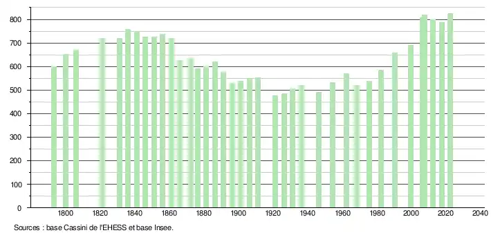 | L'évolution du nombre d'habitants est connue à travers les recensements de la population effectués dans la commune depuis 1793. Pour les communes de moins de 10 000 habitants, une enquête de recensement portant sur toute la population est réalisée tous les cinq ans, les populations de référence des années intermédiaires étant quant à elles estimées par interpolation ou extrapolation[31]. Pour la commune, le premier recensement exhaustif entrant dans le cadre du nouveau dispositif a été réalisé en 2007[32]. En 2022, la commune comptait 824 habitants[Note 9], en évolution de +4,04 % par rapport à 2016 (Aude : +2,65 %, France hors Mayotte : +2,11 %). |