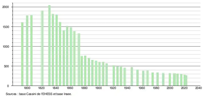 L'évolution du nombre d'habitants est connue à travers les recensements de la population effectués dans la commune depuis 1793. Pour les communes de moins de 10 000 habitants, une enquête de recensement portant sur toute la population est réalisée tous les cinq ans, les populations de référence des années intermédiaires étant quant à elles estimées par interpolation ou extrapolation[14]. Pour la commune, le premier recensement exhaustif entrant dans le cadre du nouveau dispositif a été réalisé en 2005[15].