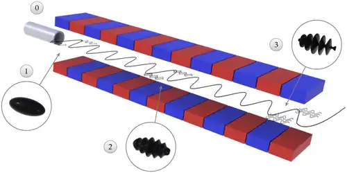 - Un faisceau d'électrons relativistes produit par un accélérateur de particules. Ce faisceau est injecté dans un ondulateur, une structure où règne un champ magnétique spatialement périodique. Les électrons "ondulent" dans ce dispositif en émettant du rayonnement X similaire au rayonnement synchrotron.