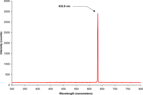 La longueur d'onde du rouge des lasers à hélium-néon est habituellement donnée pour 632 nm. Cependant, sa valeur exacte dans l'air étant 632,816 nm, 633 nm serait plus proche de la vérité. Pour calculer l'énergie du photon, il faut retenir la valeur de la longueur d'onde dans le vide qui est de 632,991 nm. La longueur d'onde de fonctionnement précise varie d'environ 0,002 nm en raison de la dilatation thermique de la cavité. Il existe des versions stabilisées dont la précision est de l'ordre de 10-12 nm[4].